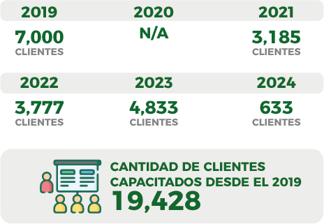 (27 a empleados y 10 a clientes) y capacitado a 4,833 cleintes en Desarrollo Empresarial y Talleres de Emprendimiento,